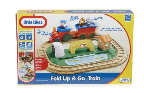 Little Tikes Fold Up 'N Go TrainThis interactive zoo train is terrific for take-along fun! The Fold Up 'N Go Train is motorized and works both on and off the tracks. Simply press down on the three characters to hear the sounds of life on the rails. The track folds up for easy storage and portability. Requires 3-AA batteries (not included). Recommended for ages 1 1/2 years and up.