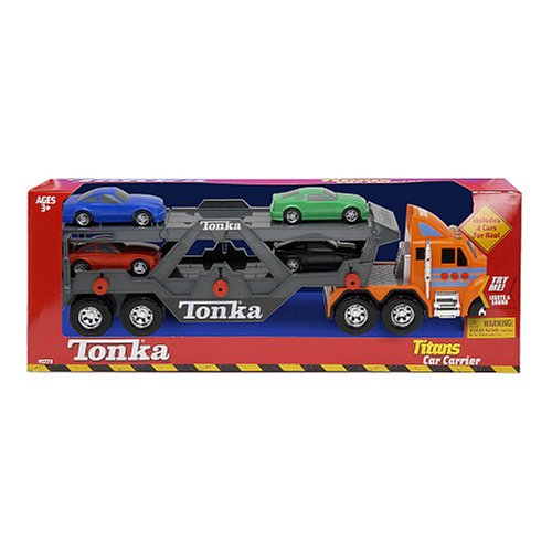 If you love Tonka, then you'll have your hands full with this Tonka Titan Car Carrier. Sturdy Tonka construction and incredible detail are combined in one great vehicle. This large free-wheeling Tonka Titans Car Carrier is equipped with realistic lights & sounds! It includes 4 plastic vehicles to transport on the carrier with levers to manipulate the carrier to move and release the cars.